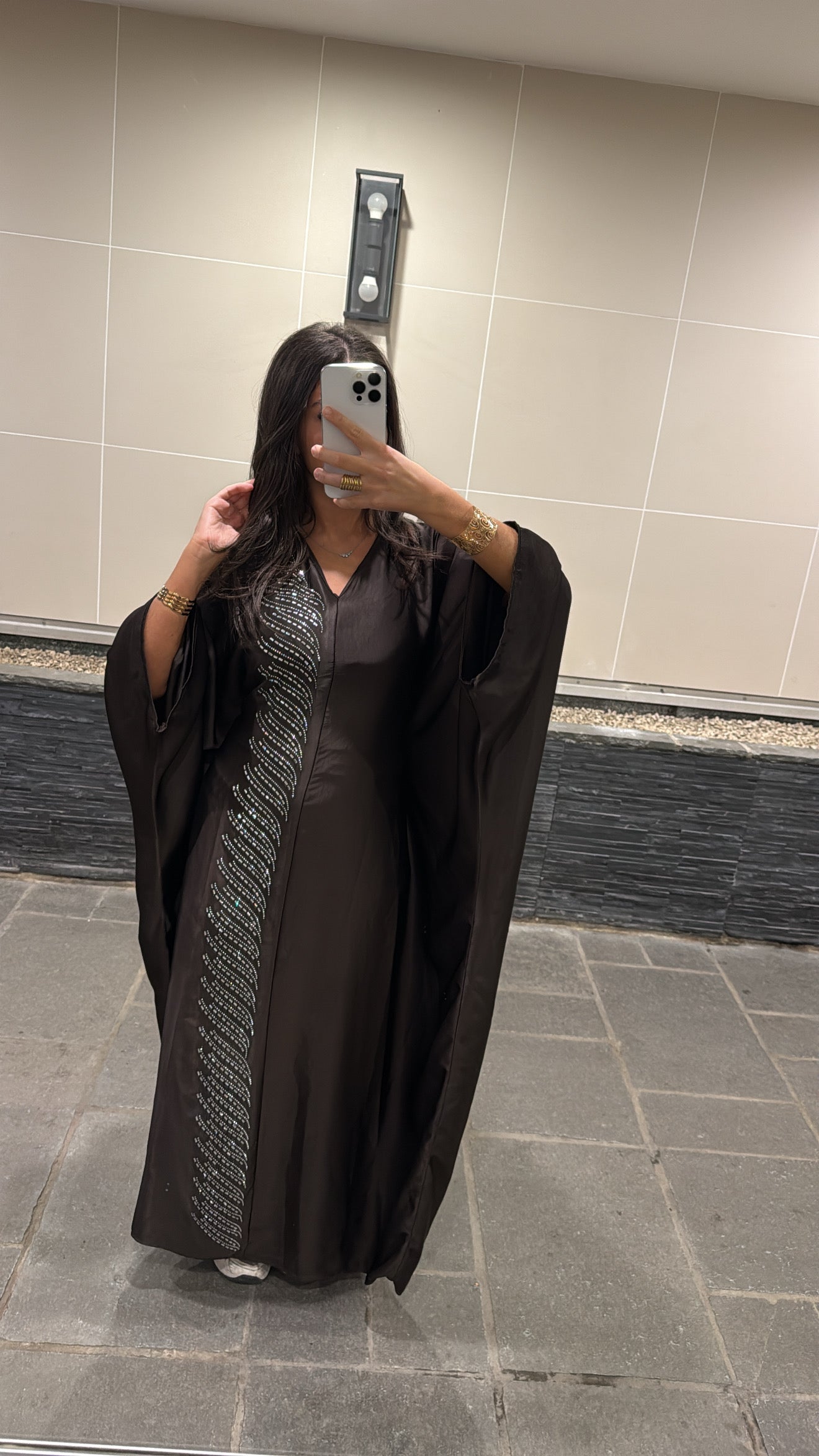Abaya sarah a ceinture intérieure marron chocolat , avec des strass sur un côté