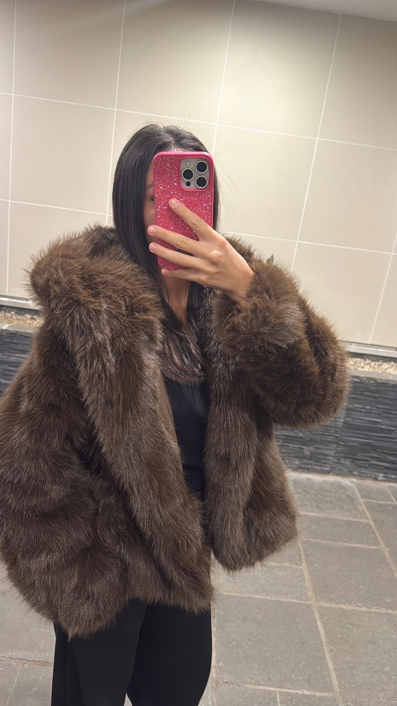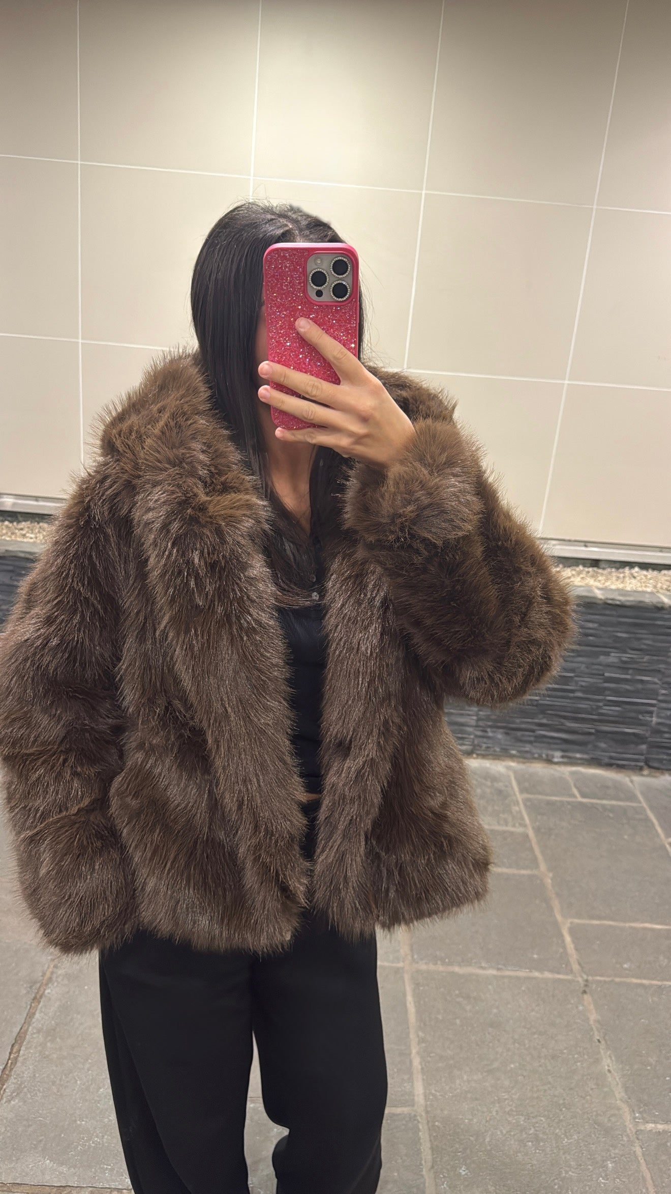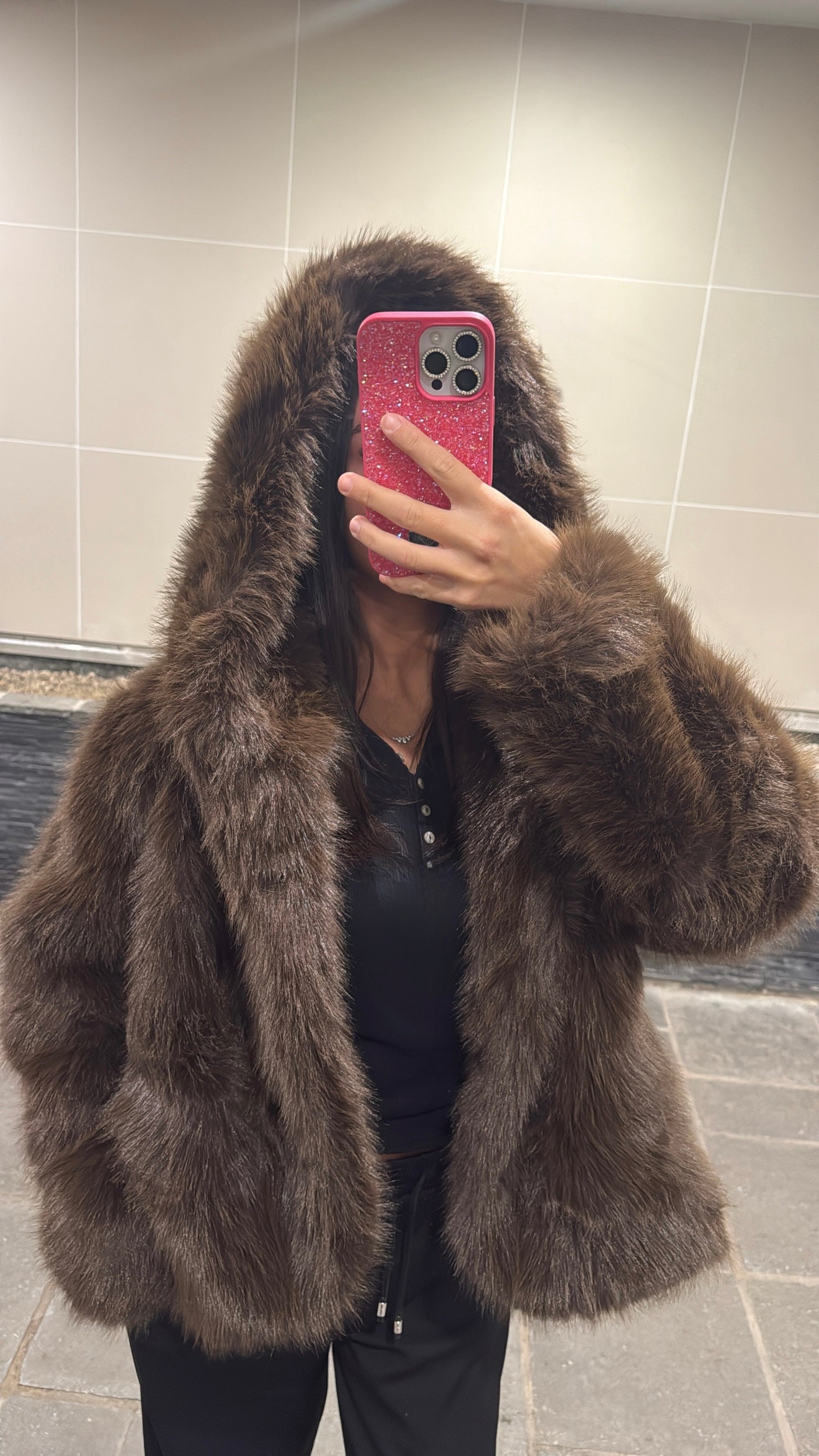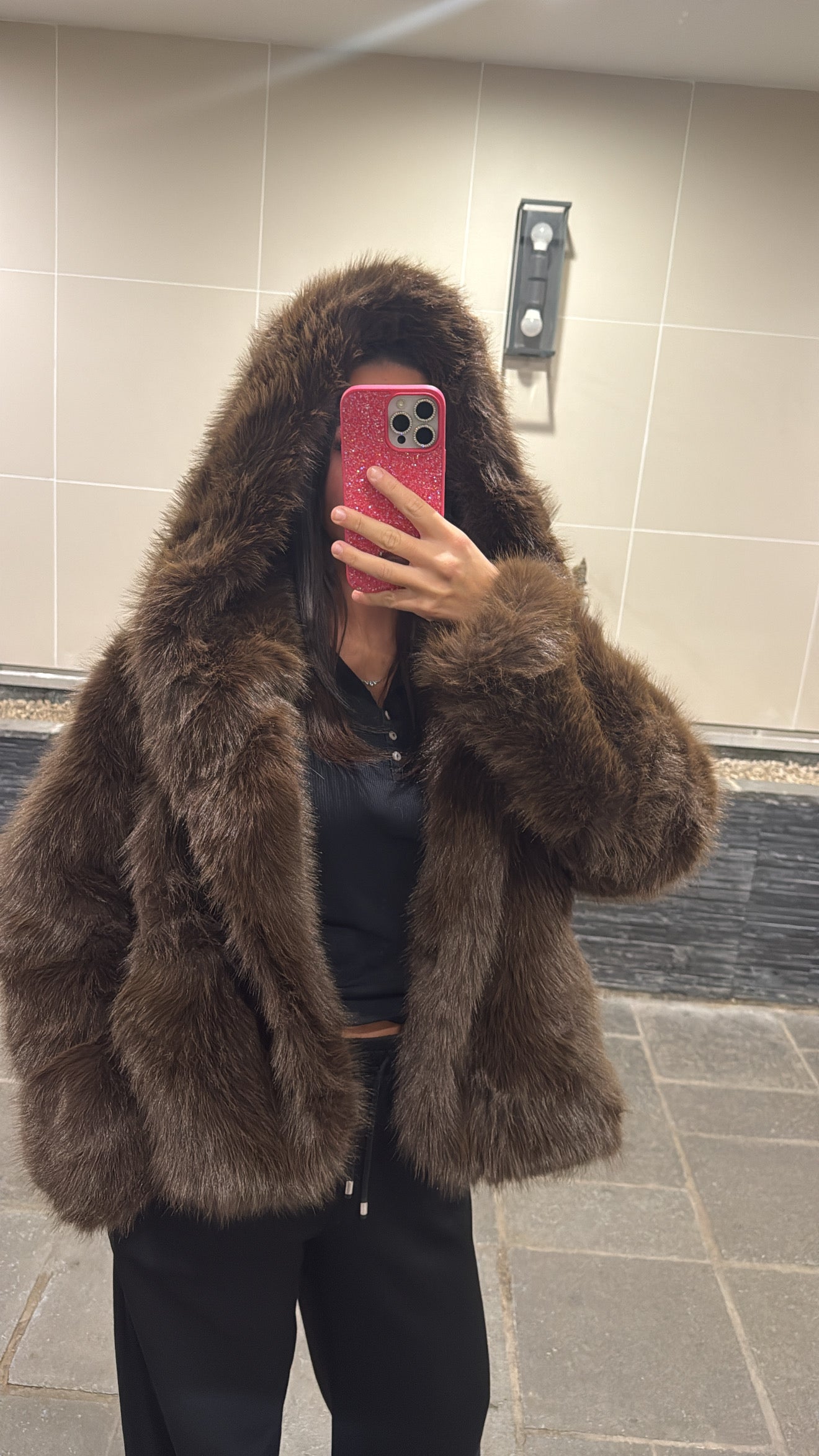 Fourrure chaudd , capuche , avec 2 poches fermeture avec boutons . Longueur 55 cm